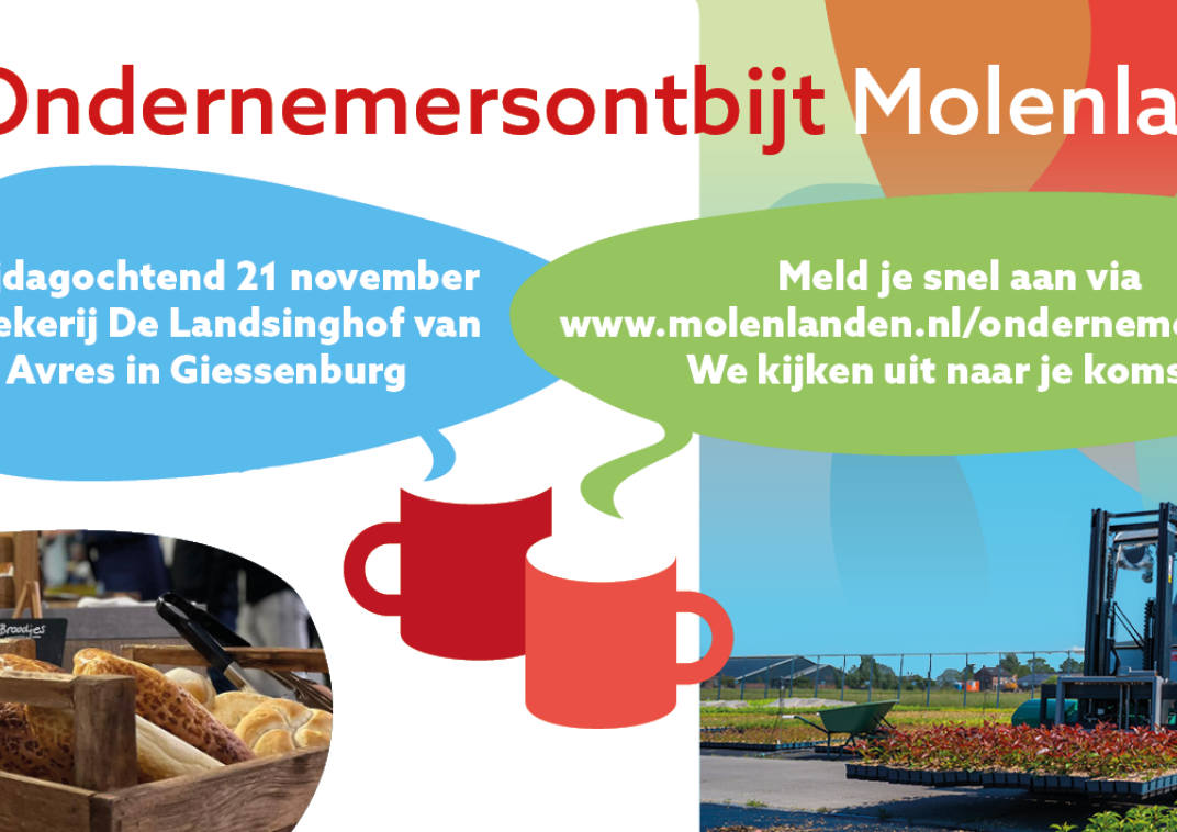 Ondernemersontbijt Molenlanden 17 oktober 2025 Vrijdag 21 november is de Dag van de Ondernemer. Gemeente Molenlanden organiseert op deze speciale dag opnieuw het ondernemersontbijt.